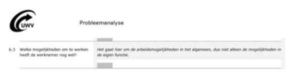 Maar check ook aspect 6.3. “Welke mogelijkheden om te werken heeft de werknemer nog wel?” Met als toelichting, om de bedrijfsarts hierin te sturen: “het gaat hier om de arbeidsmogelijkheden in het algemeen, dus niet alleen de mogelijkheden in de eigen functie”. Dat is een nog essentiëlere vraag die zich namelijk richt op de (arbeids)mogelijkheden. Dit is de kern.